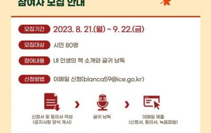 인천광역시교육청중앙도서관은 개관 40주년을 기념해 「40인 낭독 챌린지」를 운영하고, 참여자를 오는 21일부터 9월 22일까지 모집한다.40인 낭독 챌린지는 시민들이 직접 ‘내 인생의 책’을 선정하여 낭독하는 특별 프로그램으로, ‘낭독’의 방식을 활용하여 시각적, 청각