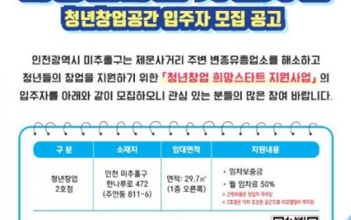 인천 미추홀구는 이달 25일까지 ‘청년창업 희망스타트 지원사업’의 일환으로 청년 창업 공간 2호점의 입주자를 모집한다.‘청년창업 희망스타트 지원사업’은 제운사거리 인근 변종유흥업소를 정비하여 청년 창업 공간을 조성, 청년에게 창업의 기회를 제공하는 사업으로 현재 15개