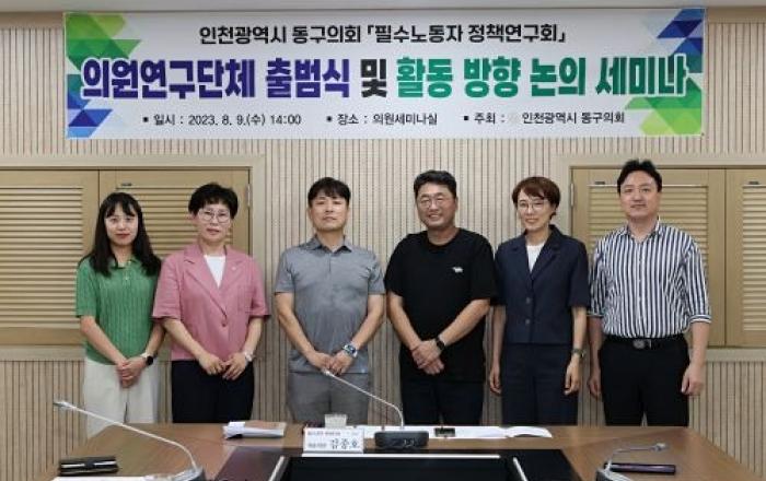 인천 동구의회 의원연구단체인 ‘필수노동자 정책연구회’는 9일 동구의회 건물 4층 의원세미나실에서 출범식 겸 활동 방향 논의를 위한 세미나를 갖고 본격적인 연구활동에 돌입했다. ‘필수노동자 정책연구회’는 김종호 의원이 대표 의원을 맡고 장수진 기획총무위원회 위
