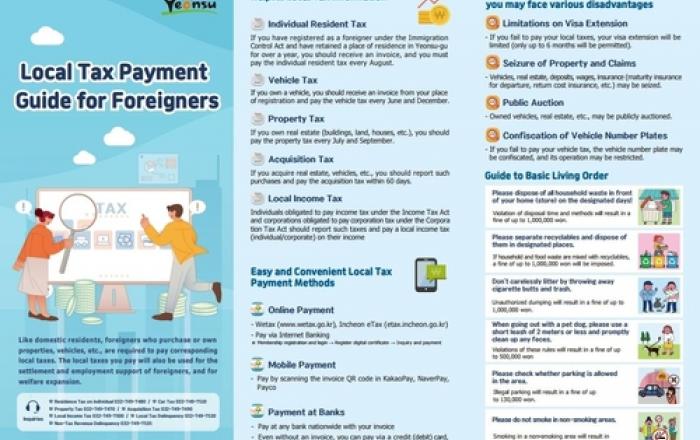 연수구는 외국인 주민의 납세편의를 위해 지방세 기본 정보와 일상생활에서 지켜야 하는 기초질서 수칙을 담은 지방세·세외수입 외국어 안내 리플릿을 제작·배부했다. 연수구 외국인 등록자 수는 2023년 6월 말 기준 1만 5천여 명이며, 인천시에 등록된 외국인의 20%