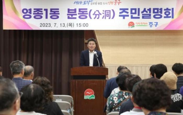 인천시 중구(구청장 김정헌)는 올해 인구 5만 명을 돌파한 ‘영종1동’의 분동과 관련, 주민들의 목소리를 청취하는 자리를 마련했다. 인천시 중구는 지난 13일 오후 영종1동 행정복지센터 5층 대강당에서 김정헌 중구청장, 강후공 중구의회 의장, 구의원, 지역주민 등 8