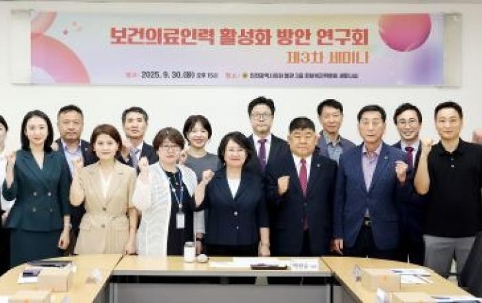 인천광역시의회 의원연구단체인 ‘보건의료인력 활성화 방안 연구회(대표의원 박판순)’는 30일 문화복지위원회 세미나실에서 박판순 대표의원(국·비례)을 비롯해 박창호(국·비례)·이봉락(국·미추홀구3) 의원, ‘의료기사단체 정책연구단’관계자 등이 참석한 가운데 ‘제3차 정책