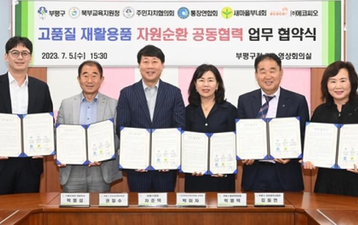 부평구는 지난 5일 구청에서 고품질 재활용품 순환체계 구축을 위해 민·관·학 공동협력을 다짐하는 업무협약을 체결했다. 이날 협약식에는 부평구와 인천광역시북부교육지원청, 주민자치협의회, 통장연합회, 새마을부녀회 및 ㈜에코씨오가 함께 자리했다. 이번 협약은 투명 페