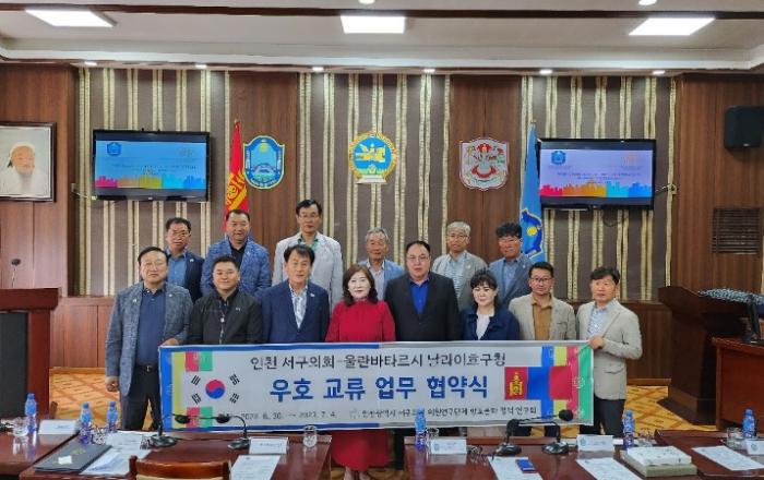 인천 서구의회 의원연구단체 「인천시 서구 향토문화 정책연구회」 (대표자 심우창)는 지난 1일 몽골의 날라이흐구청과 교류 협력을 위한 협약을 체결했다. 인천시 서구 향토문화 정책연구회는 대외적으로 경쟁력 있는 서구로 거듭나기 위해 몽골의 친환경 정책 및 도시조성 실태 등