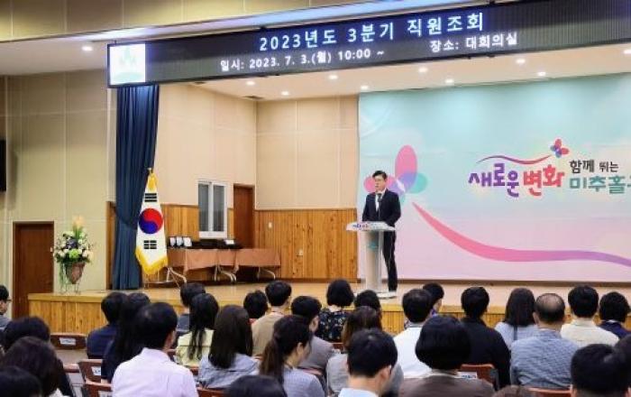 인천 미추홀구 이영훈 구청장이 취임 1주년을 맞은 3일 직원 조회에서 민선8기 지난 1년을 돌아보며 새로운 각오를 다짐했다.미추홀구는 지난 1년간 ▲수봉공원 스카이워크 조성을 위한 지방재정 인천시 투자심사 완료 ▲인천남부교육지원청 도화동 구 선인재단 부지 내 이전 결정