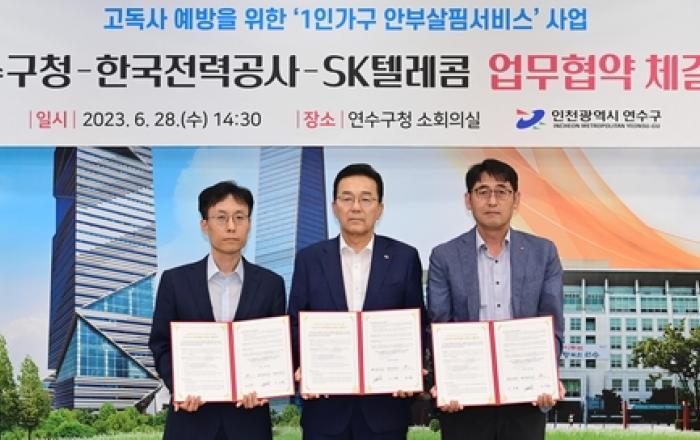연수구는 지난 28일 한국전력공사(이하 '한전'), SK텔레콤(이하 'SKT')과 고독사 예방을 위한 1인 가구 안부살핌서비스 업무협약을 체결했다. 이날 협약식에는 이재호 연수구청장, 이상원 한국전력공사 남인천지사장, 최낙훈 SK텔레콤 부사장이 참석해 1인 가구 안