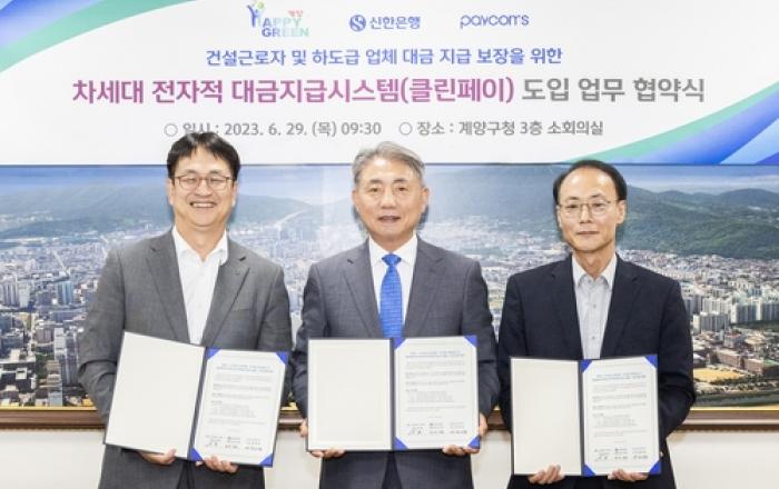 인천광역시 계양구는 29일 계양구청 소회의실에서 신한은행, ㈜페이컴스와 함께 차세대 전자적 대금지급시스템 '클린페이' 도입을 위한 업무협약을 체결했다. 이번 협약은 최근 건설경기 악화 등으로 인한 하도급업체 및 근로자의 임금 체불을 사전에 예방하고, 자금 집행의 투