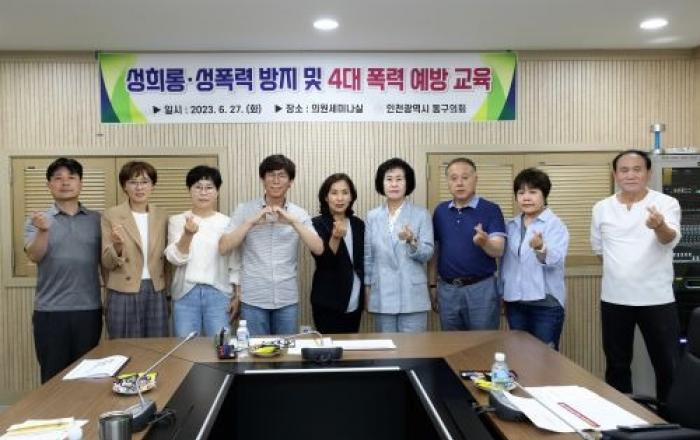인천 동구의회는 지난 27일 의원세미나실에서 동구의회 의원 및 의회사무과 직원들을 대상으로 4대 폭력(성희롱, 성매매, 성폭력, 가정폭력) 예방교육을 실시했다고 밝혔다. 이번 교육은 『양성평등기본법』 및 『성폭력방지 및 피해자보호 등에 관한 법률』등에 따른 법정교육으로