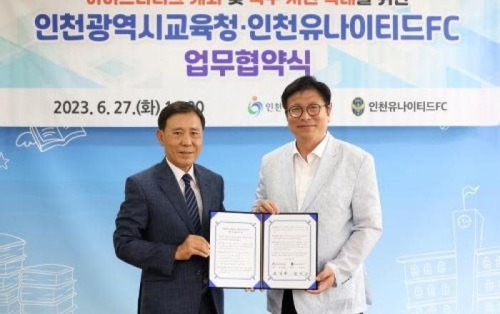 인천광역시교육청(교육감 도성훈)은 지난 27일 인천유나이티드FC와 업무협약을 체결하고 고등학교 학교스포츠클럽 축구대회 활성화를 위해 협력을 강화하기로 했다. 주요 내용은 인천유나이티드가 20년간 진행해온 중학생 대상 미들스타 축구 리그를 고등학생까지 참여를 확대하여 ‘