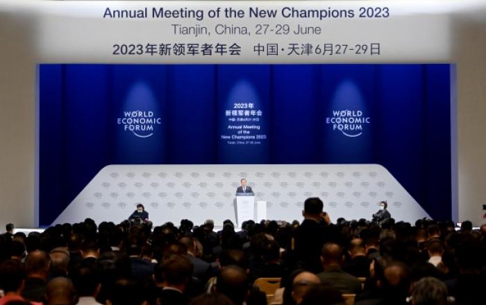 리창 중국 총리 기조연설 [ 사진출처=인천광역시]중국을 방문 중인 유정복 인천광역시장이 세계 경제 전문가들이 참여하는 세계경제포럼(WEF-World Economic Forum)에 참석해 국제 교류 협력 강화에 나섰다.인천광역시는 유정복 시장이 6월 27일 톈진 메이쟝컨