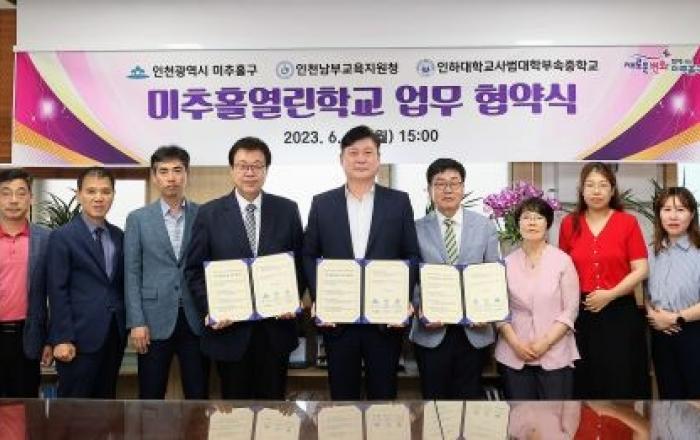 인천 미추홀구(구청장 이영훈)와 인천남부교육지원청(교육장 박종하), 인하대학교사범대학부속중학교(교장 정구선)는 26일 학교와 지역사회 연계를 통한 공유와 나눔을 실현하고자 미추홀열린학교 업무협약을 체결했다.미추홀열린학교는 주민에게 주차장, 강당, 도서관 등 학교시설을
