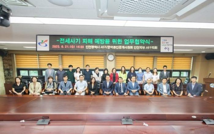 최근 전국적으로 늘어나는 ‘전세 사기’에 대응해 인천 서구가 공인중개사협회와 손을 잡고 ‘전세 사기 피해 예방 상담소’ 25곳을 운영한다. 인천 서구 강범석 구청장은 한국공인중개사협회 인천지부서구지회(지회장 홍흥표)와 21일 이 같은 업무협약을 체결했다고 밝혔다.