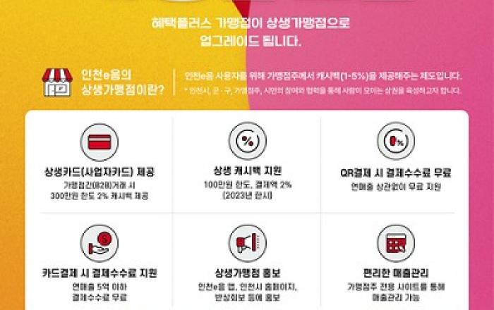 인천광역시(시장 유정복)는 인천사랑상품권의 장기적 자생방안 마련을 위해‘상생가맹점’을 상시 모집한다고 밝혔다.‘상생가맹점’은 가맹점주가 소비자(시민)에게 자발적으로 상생캐시백(1~5%)을 추가로 제공하는 인천사랑상품권 가맹점으로, 소비자에게는 캐시백의 혜택을 늘리고,