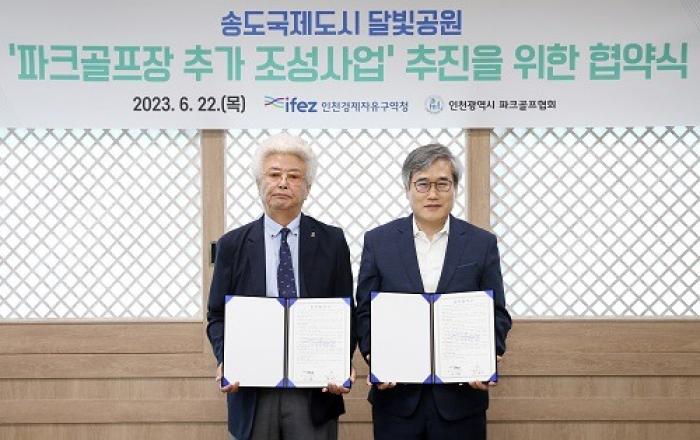인천경제자유구역청은 22일 송도국제도시 G타워에서 인천광역시 파크골프협회와 파크골프장 18홀 추가 조성과 관련한 업무협약을 체결했다고 밝혔다.협약식에는 김진용 청장, 황정오 협회 회장과 관계자 등이 참석했다.협약의 골자는 인천경제청이 추진 중인 용역과 관련해 인천광역시