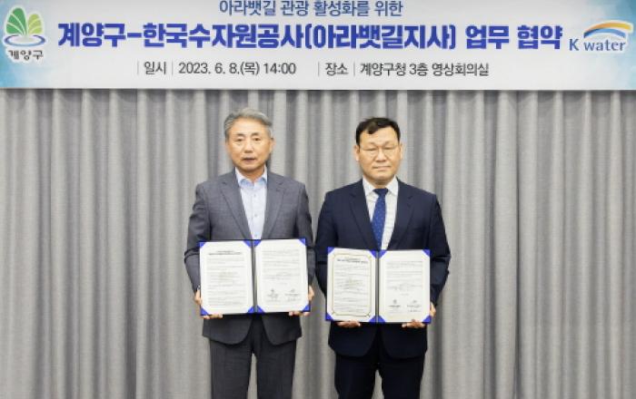 인천광역시 계양구는 8일 계양구청 영상회의실에서 한국수자원공사 아라뱃길지사(지사장 김정경)와 '아라뱃길 관광 활성화를 위한 업무 협약'을 체결했다. 계양구는 이번 업무 협약 체결을 발판으로 아라뱃길 계양권역 친수공간을 개선, 문화·관광 인프라의 확대 등 다양한 협력