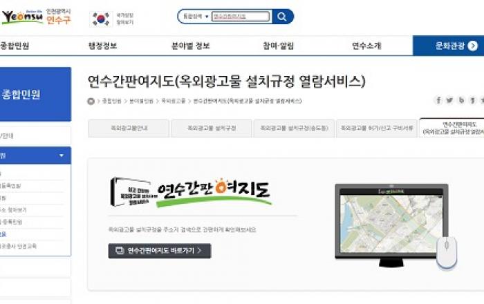 연수구는 이달부터 복잡한 옥외광고물 설치규정을 주소지 검색만으로 누구나 쉽고 간편하게 확인할 수 있는 GIS 기반 검색시스템 ‘연수간판여지도’ 서비스를 인천시 최초로 시행한다. 옥외광고물이란 건물밖에 설치하는 광고물로 각종 간판, 현수막, 스크린 등이 있으며, 옥외광고