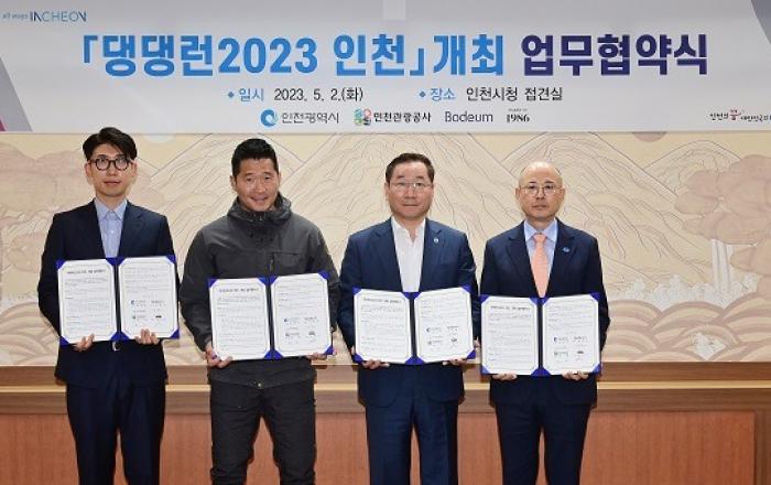 인천광역시와 인천관광공사는 5월 2일 ㈜보듬컴퍼니(대표 강형욱), ㈜1986프로덕션(대표 윤명호)과 반려견 동반 마라톤 ‘댕댕런 2023 인천’ 업무 협약을 체결했다고 밝혔다.이번 협약을 통해 ‘댕댕런’ 행사를 오는 10월 15일 인천에서 개최하게 되며, 개통령 강형욱