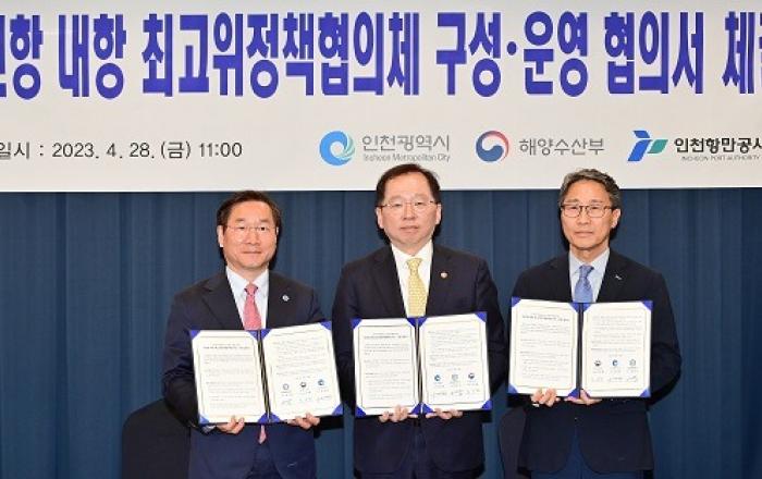 인천광역시 유정복 시장은 28일 중구 하버파크호텔에서 인천광역시, 해양수산부, 인천항만공사로 구성된 ‘인천항 내항 최고위정책협의체 구성‧운영 협의서’를 체결했다고 밝혔다.이날 체결식에는 유정복 인천광역시장, 조승환 해양수산부 장관, 최준욱 인천항만공사 사장이 참석했다
