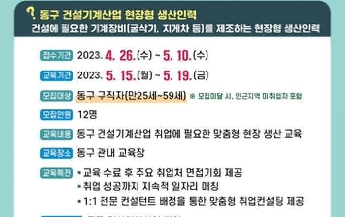 인천 동구가 2023년 지역·산업 맞춤형 일자리창출 지원 사업 공모에 선정, 1억6천만 원의 사업비를 확보했다. 이에 따라 지역·산업 맞춤형 일자리창출 사업을 본격 추진한다. 2023년 지역·산업 맞춤형 일자리창출 지원 사업은 인천시 공모사업으로 동구는 ㈔인천경