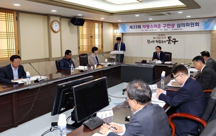 인천 동구 김찬진 구청장은 제33회 자랑스러운 구민상 수상자를 선정했다.동구는 지난 24일 자랑스러운 구민상 수상자 선정을 위한 심의위원회를 개최, 추천서가 접수된 총 17명의 대상자 중 효행상 등 5개 분야 총 6명의 수상자를 선정했다고 밝혔다.이번 수상자로는 ▲효행