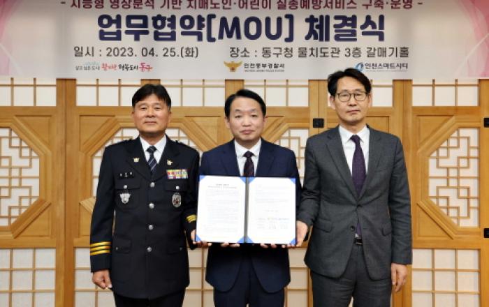 인천 동구가 지능형 영상분석을 기반으로 치매 노인 및 어린이 등 사회적 약자를 위한 실종 예방서비스를 구축한다. 동구는 지난 25일 중부경찰서 및 스마트시티㈜와 '지능형 영상분석 기반 치매 노인·어린이 실종 예방서비스 구축·운영'을 위한 업무협약을 체결했다. 협