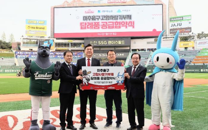 인천 미추홀구(구청장 이영훈)는 지난 14일 고향사랑기부제 활성화를 위해 문학야구장에서 신세계야구단과의 협약식을 개최했다.고향사랑기부제는 자신이 거주하지 않는 지자체에 일정액(연간 500만원 이하)을 기부하면 10만 원까지 전액 세액공제(10만 원 초과분은 16.5%)