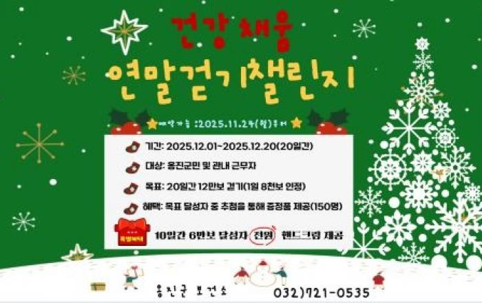 옹진군(군수 문경복)은 연말을 맞아 오는 12월 1일부터 20일까지 총 20일간 운영되는 12월 워크온 「건강채움, 연말걷기」챌린지 참가자를 24일부터 모집한다고 밝혔다.이번 12월 챌린지는 올해를 마무리하는 마지막 걷기 챌린지로, 군민의 걷기 실천 분위기를 확산하고