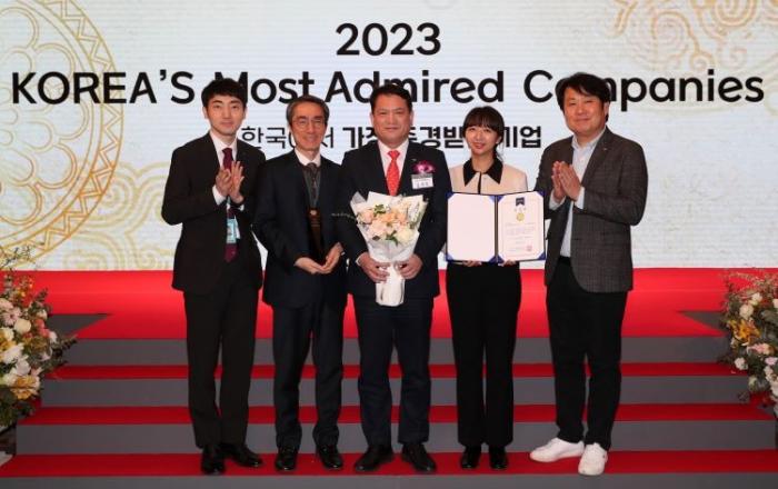 유구종 경영실장 왼쪽에서 두 번째, 김경욱 사장 왼쪽에서 세 번째 [사진=인천공항공사]인천국제공항공사(사장 김경욱)는 지난 17일 오전 한국능률협회컨설팅(KMAC) 주관으로 여의도 콘래드 호텔에서 열린‘2023 한국에서 가장 존경받는 기업’