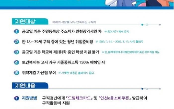 인천광역시는 구직청년의 구직활동을 지원하는 '2023년 드림체크카드 사업' 참여자를 오는 3월 31일까지 모집한다고 밝혔다. '드림체크카드'는 경제적으로 어려움을 겪고 있는 미취업 청년에게 구직활동비를 지원해 청년들의 생활적인 안정을 도모하고, 취업 활동을 돕기 위