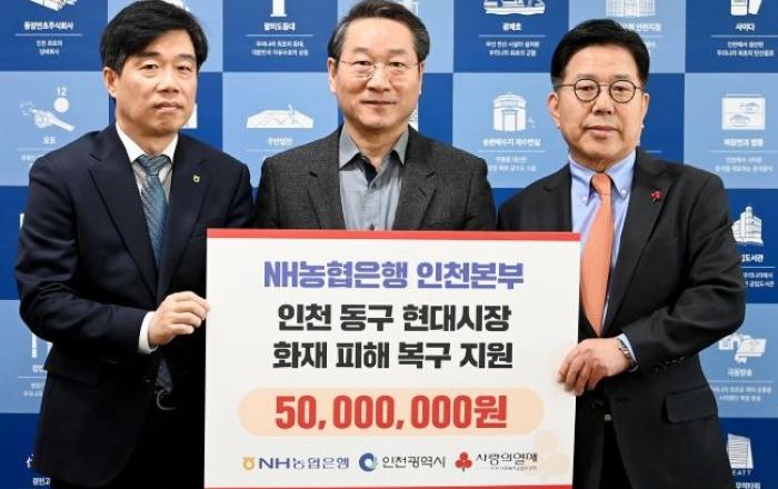 인천광역시는 13일 시청 접견실에서 NH농협은행 인천본부가 인천사회복지공동모금회에 동구 현대시장 피해 지원 성금 5천만원을 전달했다고 밝혔다.이날 전달식에는 유정복 시장, NH농협은행 곽성일 인천본부장, 조상범 인천시 사회복지공동모금회장 등이 참석했다.기부금