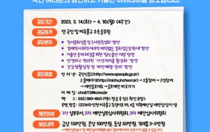 인천 미추홀구(구청장 이영훈)는 3월 14일부터 4월 10일까지 2023년도 미추홀구 국정시책 아이디어 제안을 공모한다고 밝혔다.이번 공모전은 제안제도를 통해 국정시책과 관련된 국민 및 구 소속 공무원의 창의적인 정책 아이디어를 발굴하고, 발굴된 제안을 시책사업에 반영