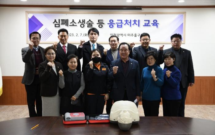미추홀구의회는 의회 세미나실에서 구 의원 및 직원을 대상으로 ‘심폐소생술 등 응급처치 교육’을 지난 7일 실시 했다.이번 교육은 미추홀소방서와 연계해 심폐소생술 방법과 자동심장충격기(AED) 사용법 등을 익혀 응급상황 발생 시 직원들의 대처 능력을 향상시키기 위한 교육