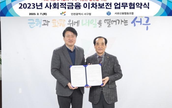 인천 서구(구청장 강범석)가 서로신협과 ‘2023년 사회적금융 이차보전 업무협약’을 체결하고 사회적경제기업 지원에 힘을 모은다고 7일 밝혔다. 이날 협약식에는 강범석 서구청장과 윤정섭 서로신협 이사장, 김재필 서구 사회적기업협의회장이 참석한 가운데 사회적경제기업의