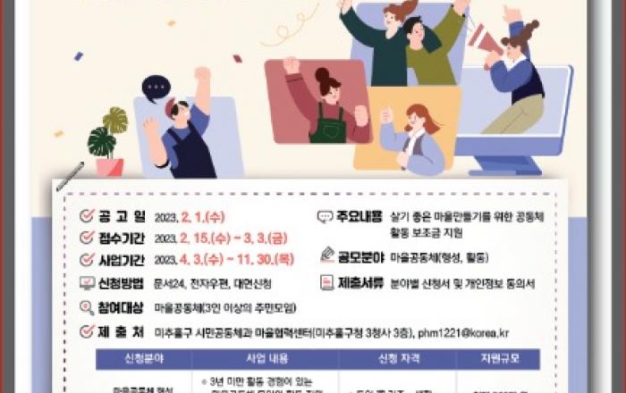 인천 미추홀구(구청장 이영훈)는 주민주도형 마을만들기 확장과 마을공동체 문화 향상을 위해 주민공모사업인 2023년 미추홀구 마을공동체 만들기 지원사업을 시작한다.이번 지원사업은 주민주도형 마을만들기를 위한 공동체 활동 보조금을 지원하며 오는 15일부터 다음달 3일까지