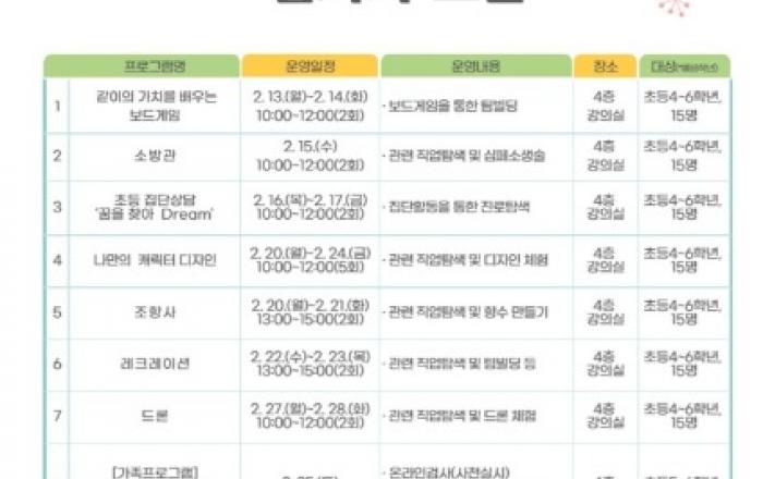 인천 미추홀구(구청장 이영훈)는 오는 2월 방학을 맞아 초등 연령 청소년과 가족이 참여할 수 있는 다양한 진로 프로그램을 운영한다.이번 청소년 대상 프로그램은 인성 보드게임, 나만의 캐릭터디자인, 조향사, 드론, 집단상담 등이 있으며 가족 대상 프로그램으로는 부모 자녀