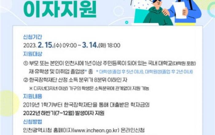 인천시(시장 유정복)는 한국장학재단에서 대출받은 대학(원)생 학자금대출(등록금, 생활비)의 부담을 덜어주기 위해 대출금 이자를 지원한다고 26일 밝혔다.이번 지원대상은 부모 또는 본인이 1년 이상 계속 인천시에 주민등록이 돼 있는 국내 대학교(대학원 포함) 재·휴학생