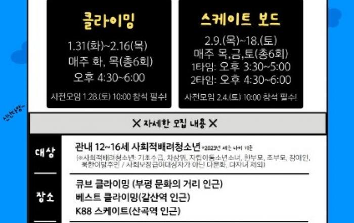 인천시 부평구 청소년수련관이 오는 17일까지 2023 모여라희망캠프 '올겨울 레포츠 어때?' 참가자를 모집한다.'올겨울 레포츠 어때?'는 겨울방학을 맞은 청소년을 위해 진행하는 실내 스케이트보드와 클라이밍 교육 프로그램이다. 안전을 위한 사전교육을 시작으로 기초 및 심