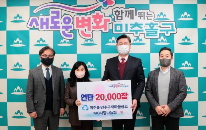 미추홀구·연수구 새마을금고 MG 사랑나눔회는 4일 저소득 주민을 위한 연탄 2만 장 을 인천 미추홀구에 기탁했다.이번에 기탁된 연탄은 (사)학산나눔재단 기탁 과정을 거쳐 미추홀구 저소득 가정 65세대에 전달될 예정이다.한편 MG 사랑나눔회는 미추홀구·연수구에 있는 새마