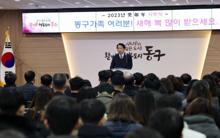인천시 동구는 2일 구청 소나무홀에서 시무식을 갖고 2023년 힘찬 출발을 알렸다.계묘년(癸卯年) 새해를 맞아 진행된 시무식에는 구 본청 및 산하 기관 직원들이 참석, 새로운 마음과 각오로 구정 수행 결의를 다졌다.김찬진 구청장은 신년사에서 ▲촘촘하고 두터운 복지안전망
