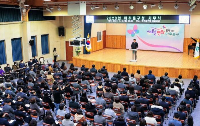 인천시 미추홀구는 2일 구청 대회의실에서 필수 민원 담당공무원을 제외한 전 직원이 참석한 가운데 시무식을 갖고 2023년 계묘년(癸卯年) 힘찬 출발을 알렸다.이영훈 미추홀구청장은 "올해는 민선8기 중점 사업들의 기틀을 다지고 이를 신속하게 시작해야 하는 중요한 한 해"