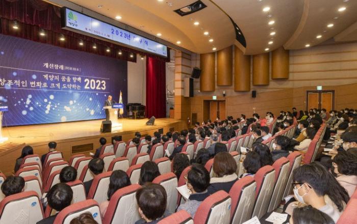 인천시 계양구는 2일 구청 대강당에서 구산하 직원 400여 명이 참석한 가운데 '2023년 시무식'을 개최하고 계묘년 새해를 향한 힘찬 발걸음을 내디뎠다.시무식은 공무원헌장과 행동강령 낭독, 신년사, 구립예술단 공연 등으로 진행됐으며, 이후 '꿈을 향한 변화의 도시,