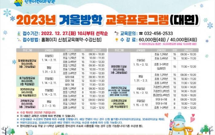 인천시설공단(이사장 김종필) 인천어린이과학관이 어린이들의 다양한 과학적 탐구심 함양을 위해 2023년 1월 14일부터 2월 12일까지 겨울방학 교육프로그램을 운영한다.이번 겨울방학 교육프로그램 신청대상은 유아 6세~초등 5학년이며, '현미경탐구교실', '알쏭달쏭실험교실