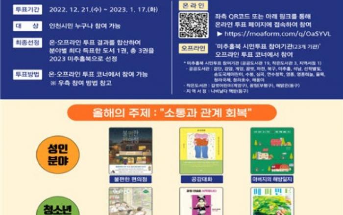 인천시 미추홀도서관은 2023년 1월 17일까지 관내 도서관 및 지역서점과 함께 2023 미추홀북 최종도서 선정을 위한 시민투표를 실시한다고 21일 밝혔다.'미추홀북'은 인천시가 2015년부터 진행해 온 한 도시 한 책 읽기 독서 운동의 일환으로, 미추홀 도서관은 매년