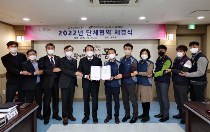 인천시 동구는 20일 전국공무원노동조합 인천지역본부 동구지부와 2022년 공무원 노조 단체협약을 체결했다고 밝혔다.이번 단체협약은 동구와 공무원 노조가 처음 체결하는 것으로 지난 9월 14일 공무원 노조가 단체교섭요구안을 제출한 이후 총 2차례의 본교섭과 3차례의 실무