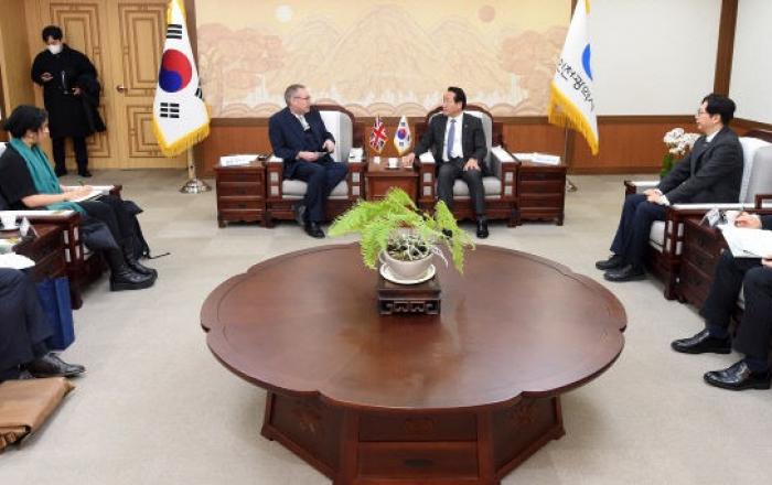 유정복 인천시장은 19일 시청 접견실에서 올해 취임한 콜린 크룩스(Colin Crooks) 주한 영국 대사를 만나 인천시와 영국 간 다양한 우호협력 방안에 대해 의견을 교환했다.이번 면담은 기후변화 대응을 위해 재생에너지 정책을 추진 중인 인천시와 영국의 다양한 노하우