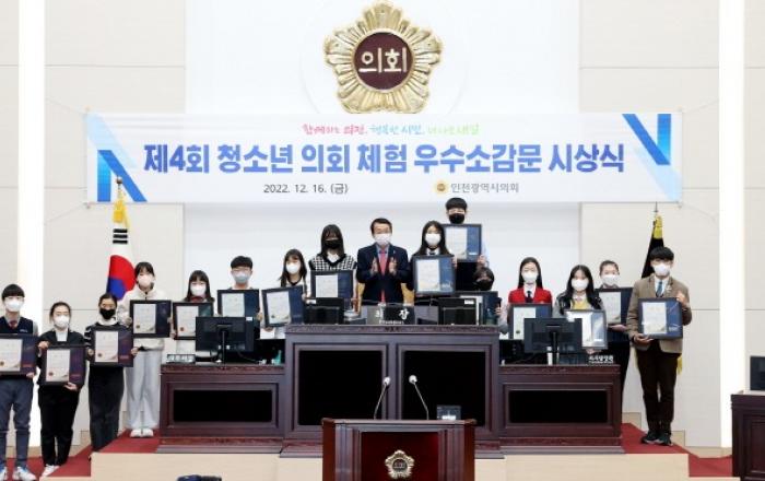 인천광역시의회(의장 허식)는 최근 본회의장에서 ‘2022년 청소년 의회체험 우수소감문’ 최우수자로 선정된 15명의 청소년이 참석한 가운데 시상식을 개최했다고 18일 밝혔다.올해 청소년 의정아카데미 프로그램에 참가한 24개 학교 601명의 학생을 대상으로 소감문을 공모한