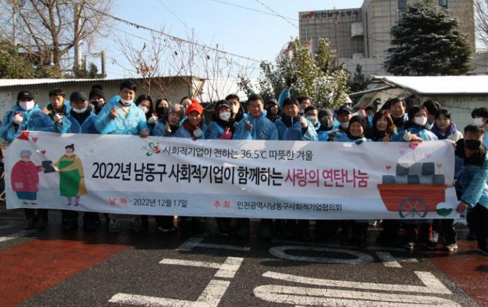 인천시 남동구 사회적기업협의회가 최근 구월동 일원에서 '사랑 가득, 온기 가득' 연탄 나눔 행사를 진행했다.19일 남동구에 따르면 이번 행사는 남동구 사회적기업 27개 업체가 연탄 3650장을 후원하고, 사회적기업 대표와 지역주민 등 60여 명이 참여해 연탄을 사용하는