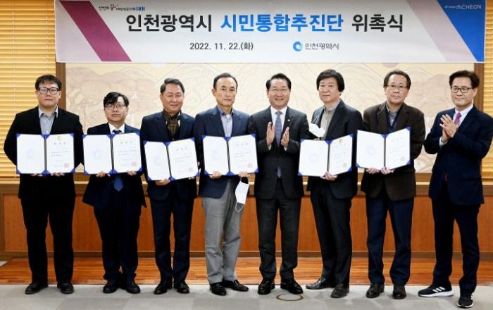 인천시는 22일 시청 접견실에서 시민통합을 위한 정책과 사업의 효율적 추진을 위해 분야별 전문가로 구성된 '시민통합추진단'을 발족하고 자문위원들에게 위촉장을 수여했다고 밝혔다.'시민통합추진단'은 서준석 인천시 시민소통특보를 단장으로, 시민사회분야 김효진 서흥꿈세움 교육