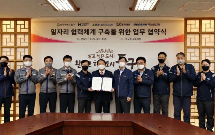 인천시 동구는 22일 갈매기홀에서 관내 대기업인 현대제철, 현대두산인프라코어, 동국제강, 두산산업차량과 '일자리 협력체계 구축을 위한 업무협약(MOU)'을 체결했다고 밝혔다.협약식에는 김찬진 동구청장을 비롯해 양종오 현대제철 인천공장장, 김병주 현대두산인프라코어 기술H