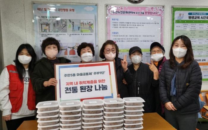 인천시 미추홀구 주안5동 마을공동체 '주부9단'이 18일 주안노인문화센터에서 급식 서비스를 지원받고 있는 홀몸노인 등 취약계층 40가구에 직접 담근 된장을 전달했다.이날 전달된 된장은 주부9단 회원들이 직접 메주를 구입하고 지난 3월에 담가 햇빛이 잘 드는 장독에 약